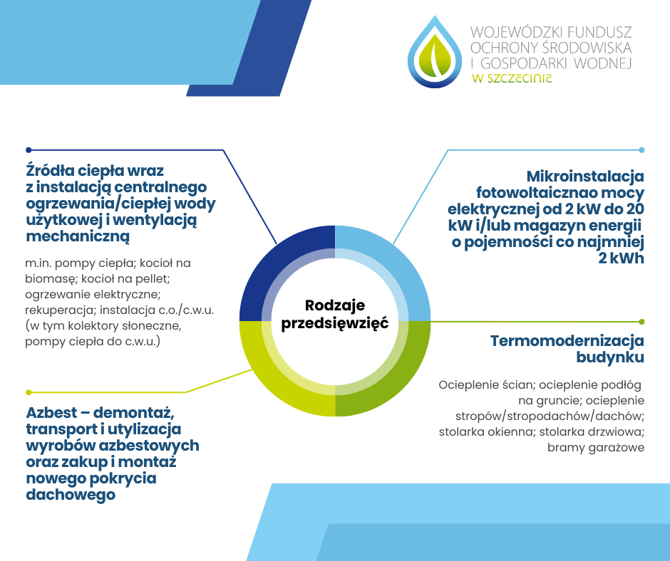 - Montaż mikroinstalacji fotowoltaicznych o mocy elektrycznej od 2 kW do 20 kW i/lub magazynów energii o pojemności co najmniej 2 kWh;