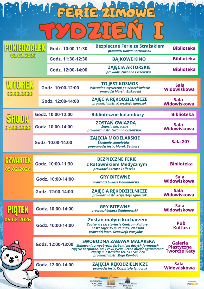 Ferie odbywać się będą w salach Centrum Kultury, biblioteki oraz sali widowiskowej. Szczegółowy harmonogram zajęć dostępny jest na plakacie informacyjnym.