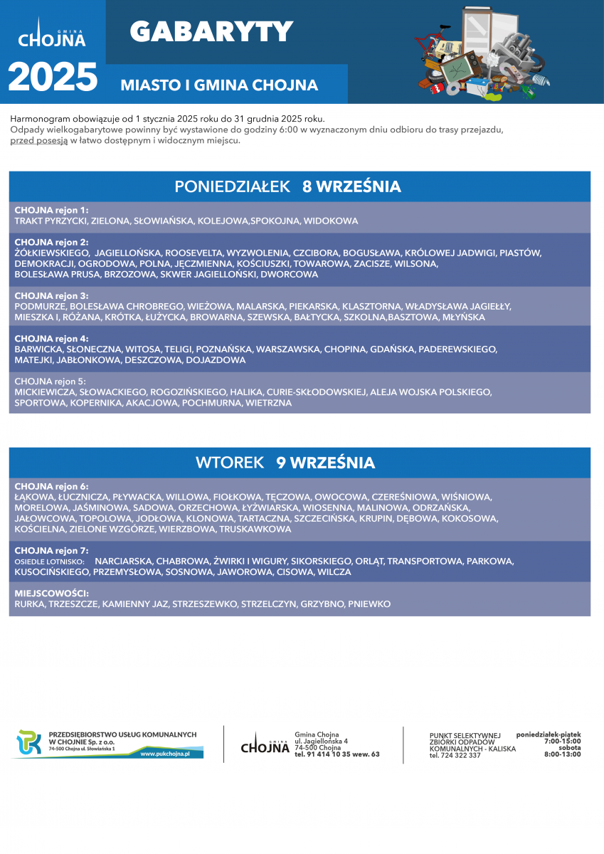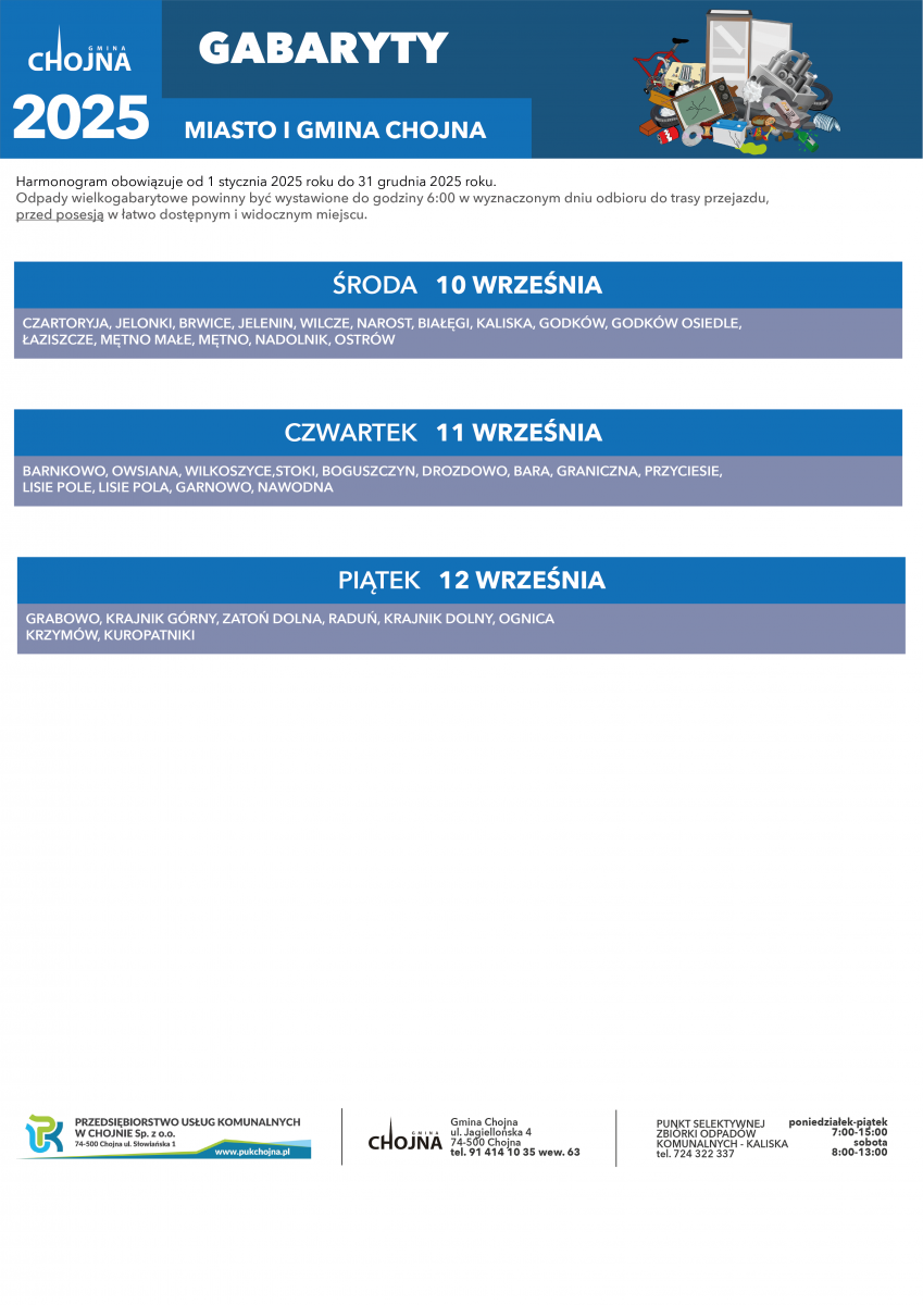 Informujemy, że na terenie gminy Chojna odbędzie się odbiór odpadów wielkogabarytowych, zgodnie z ogłoszonym harmonogramem. Przypominamy,że odpady wielkogabarytowe powinny być gromadzone, nie wcześniej niż 24 godziny przed wyznaczonym terminem odbioru, na terenie nieruchomości w miejscu przeznaczonym na gromadzenie odpadów, w sposób umożliwiający swobodny dostęp przedsiębiorcy odbierającego odpady komunalne. Odpady powinny być wystawione