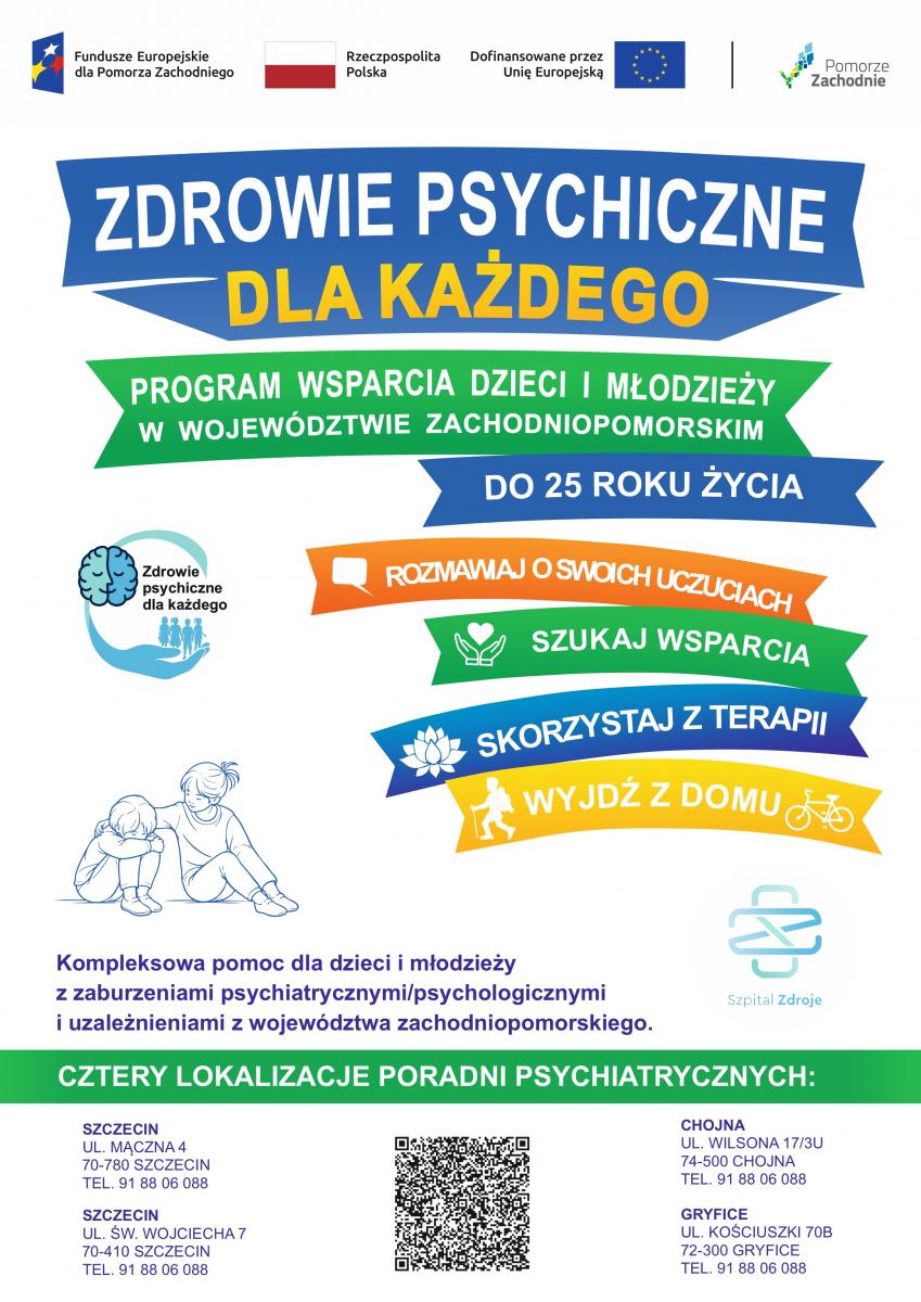 Samodzielny Publiczny Specjalistyczny Zakład Opieki Zdrowotnej „Zdroje” rozpoczął realizację świadczeń w ramach projektu „Zdrowie psychiczne dla każdego - program wsparcia dzieci i młodzieży w województwie zachodniopomorskim”. Projekt stanowi kompleksową odpowiedź na rosnące potrzeby w zakresie wsparcia psychiatrycznego i psychologicznego dzieci oraz młodzieży w regionie.